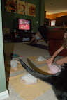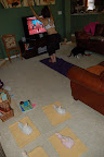 The googles stay in shape by exercising with Cindy. When she gets out her yoga mat, they run to the china cabinate and grab their mats (place mats). Here is a picture of Cin trying achieve some sort of zen state in our home environment.